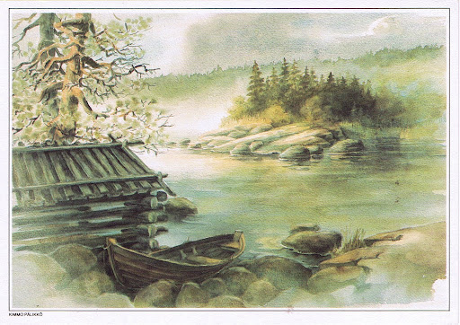 Przedstawia ona reprodukcję obrazu autorstwa Kimmo Pälikkö pt. "Venevaja" co z finskiego oznacza hangar dla łodzi. Minna napisała mi, że jest to bardzo produktywny artysta pocztówek, a na swoim koncie ma już ponad 1400 wzorów. Tematyka jego dzieł to fińska natura, domy i dawne czasy.